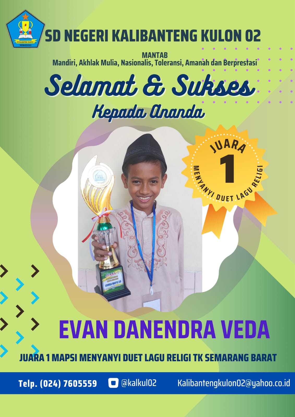Selamat kepada Ananda Evan Danendra Veda dan Ananda Agnola Elyssia Nadinea atas prestasi yang diraih sebagai JUARA 1 MENYANYI DUET LAGU RELIGI pada Lomba MAPSI Tingkat Semarang Barat Tahun 2023.