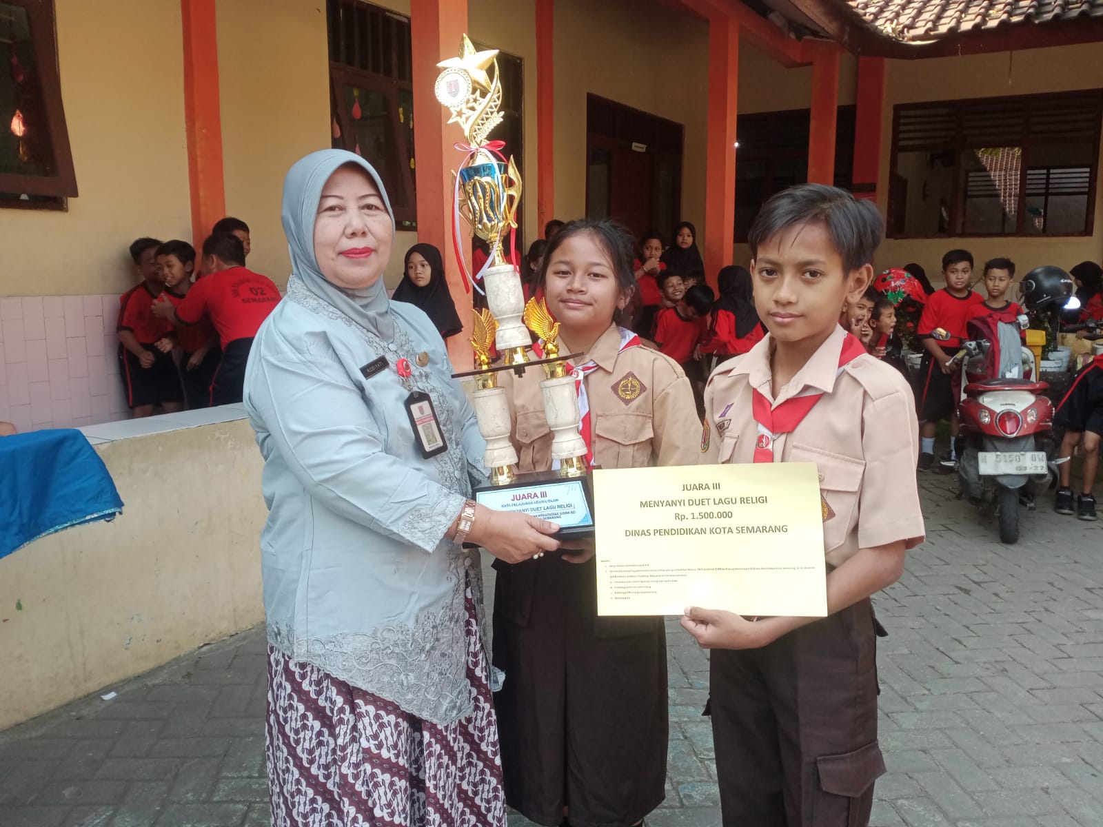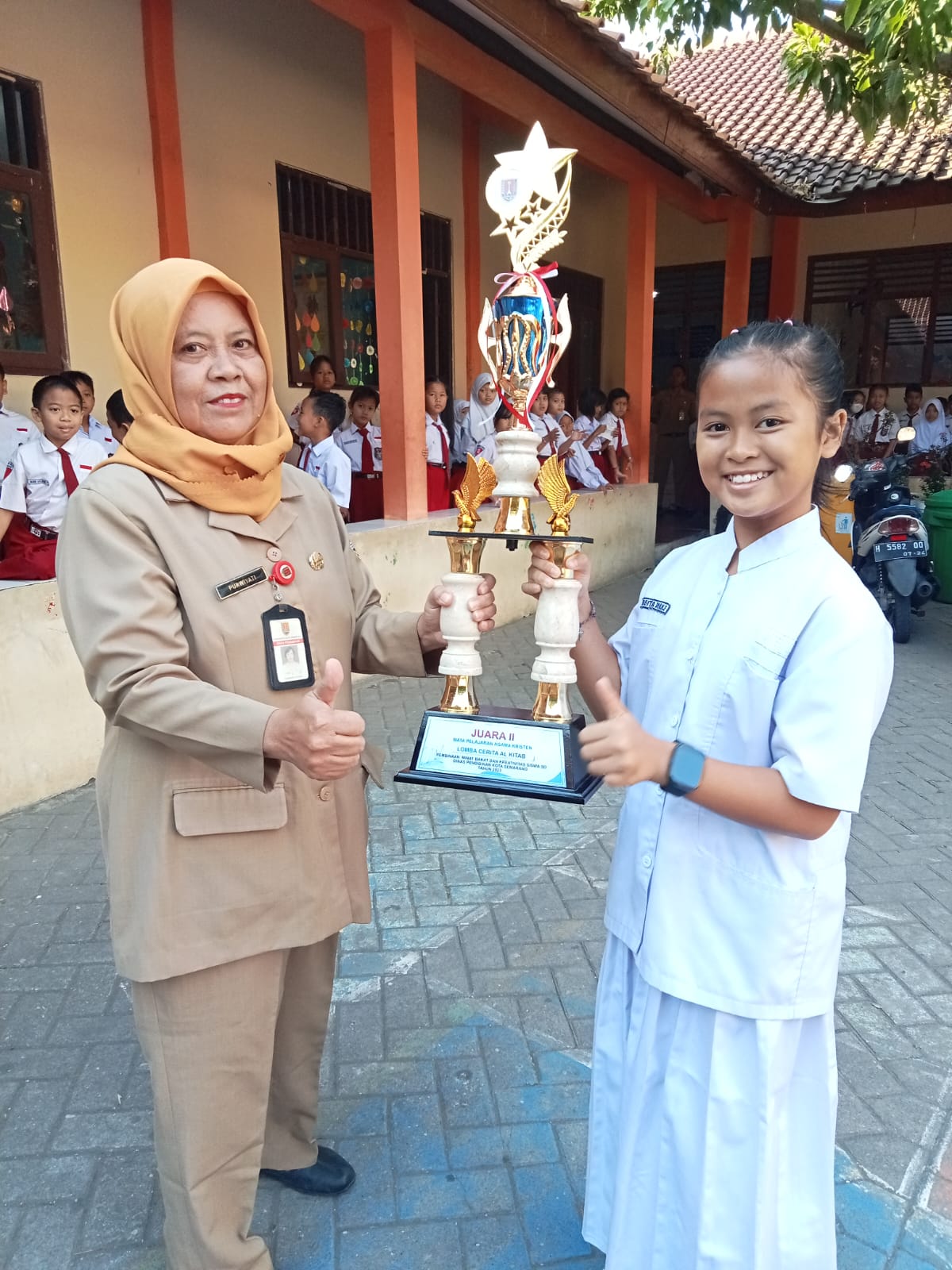 Penyerahan Piala Ke Pihak Sekolah yang diberikan langsung oleh Anggita Dian Elysia kepada Bu Purwiyati, S.Pd.SD selaku Kepala Sekolah SDN KALIBANTENG KULON 02.